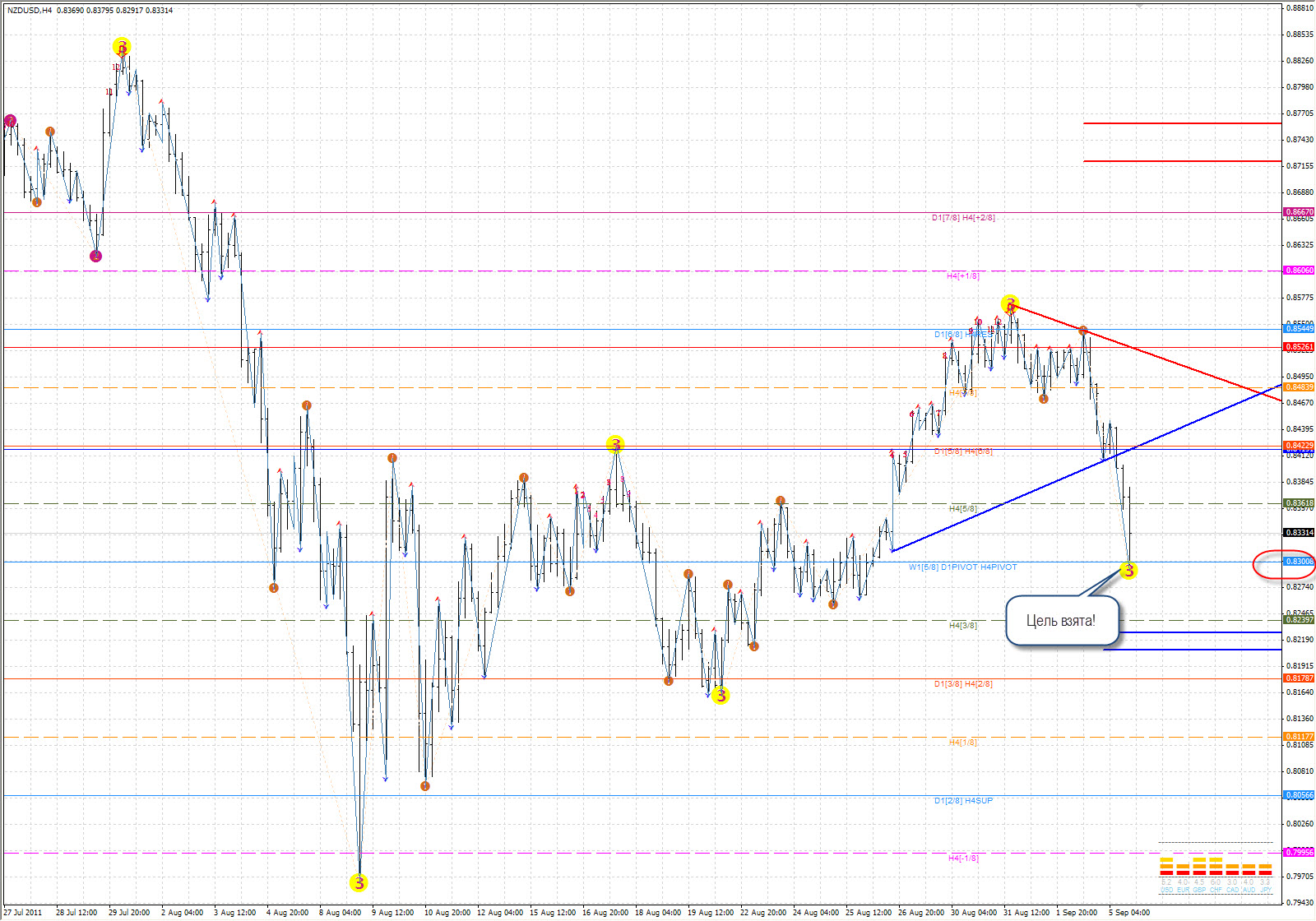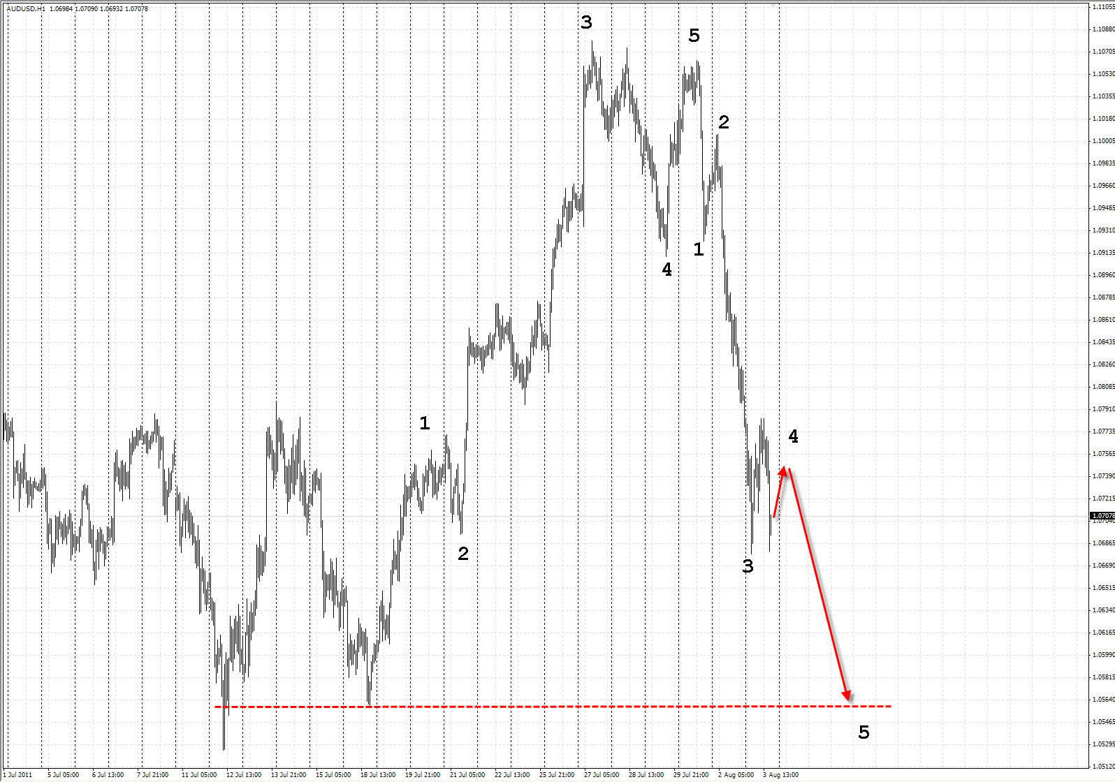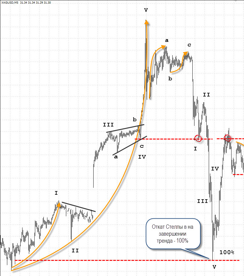 Импульс с растянутой 5-й напоминает стеллу, поэтому я назвал свою комбинацию "Стеллой". Трудно, но в принципе возможно определить завершение Растянутой 5-й, но об этом я расскажу чуть позже). Намного проще "торговать" откат Растянутой 5-й. Поэтому, этот откат и рассмотрим сейчас .) Вот как он выглядит в реальности: