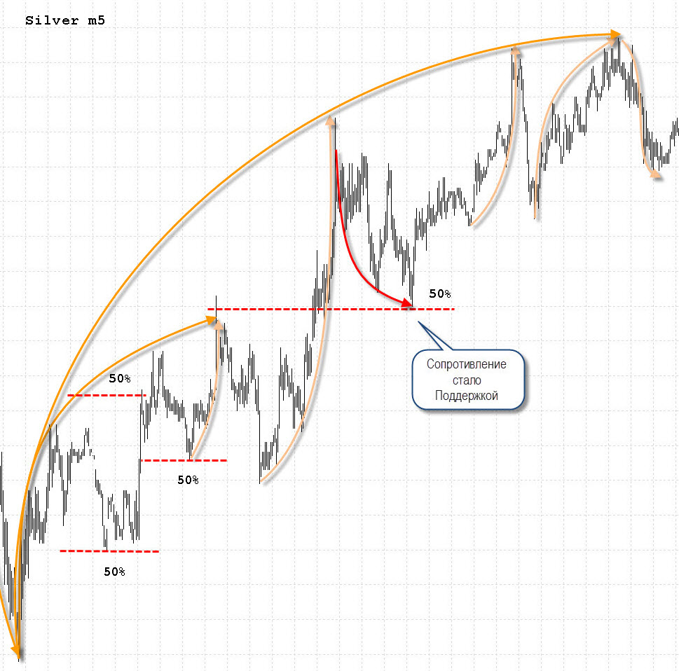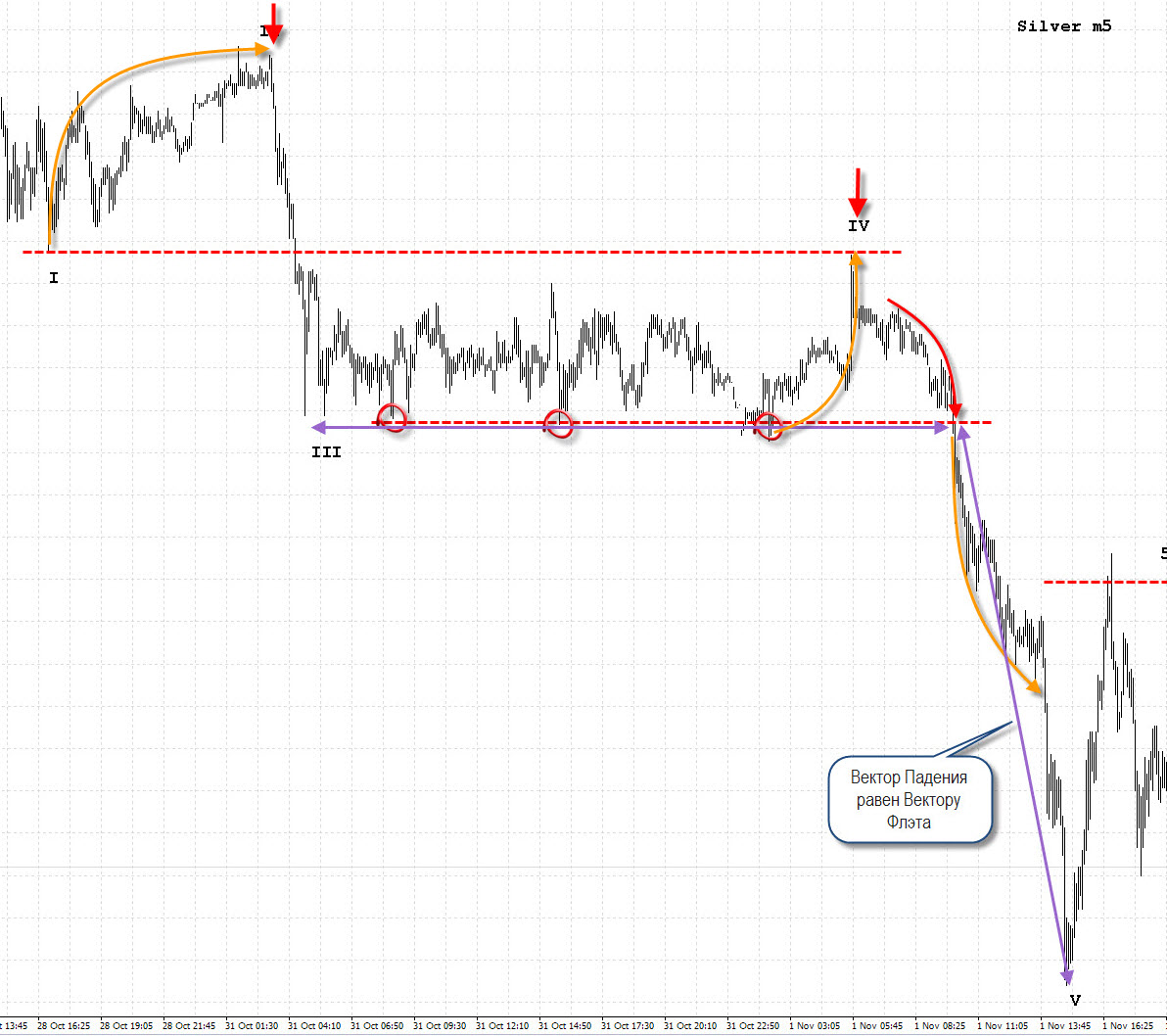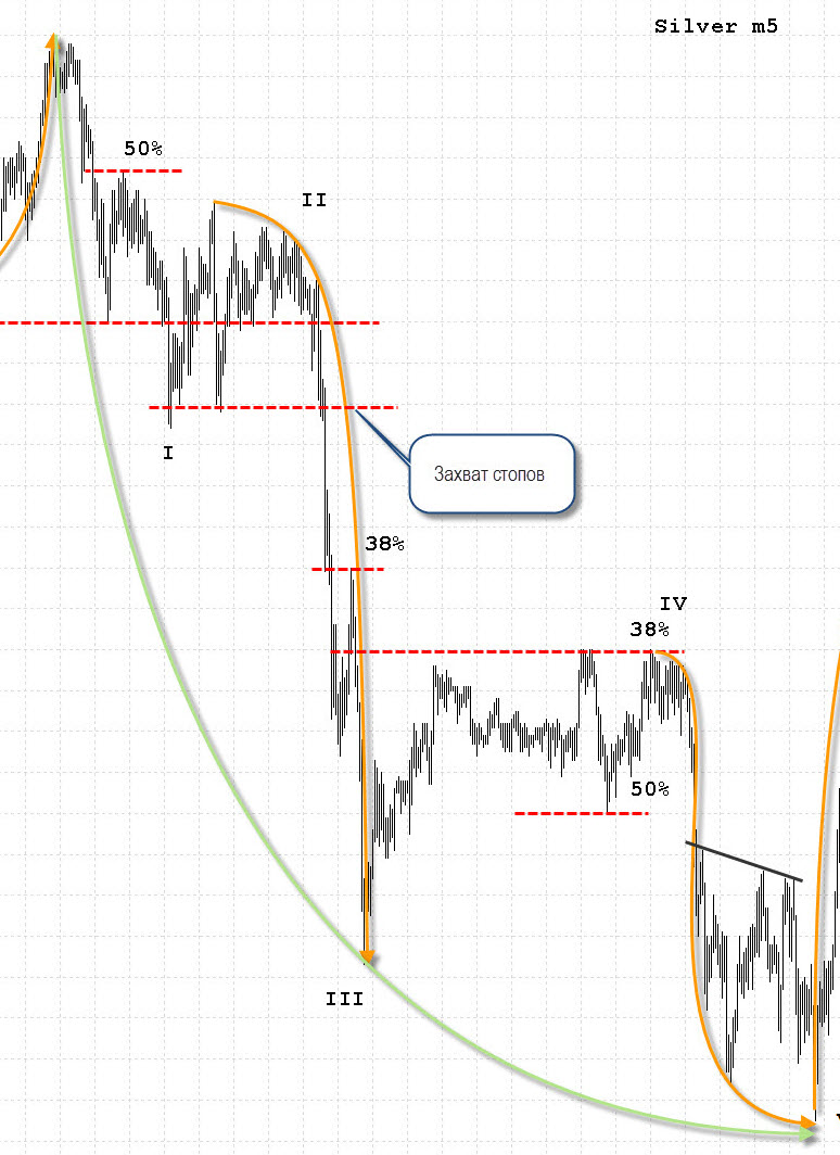 Ниже приведены примеры из 5-минутного графика Серебра. Так как волны фрактальны по своей сути, эти же комбинации могут встретиться на любом ТФ вплоть до месячного. 5-минутный график хорошо тем, что гораздо раньше выдаёт на "гору" комбинацию, которая возможно только началась на дневном или недельном графике. Серебро мне нравится своей техничностью, на его графике можно увидеть практически все комбинации встречающиеся в книге Глена Нили. Конечно, такие же комбинации (с небольшими особенностями) можно увидеть и на других активах (сырье, валютных парах и т.д.)