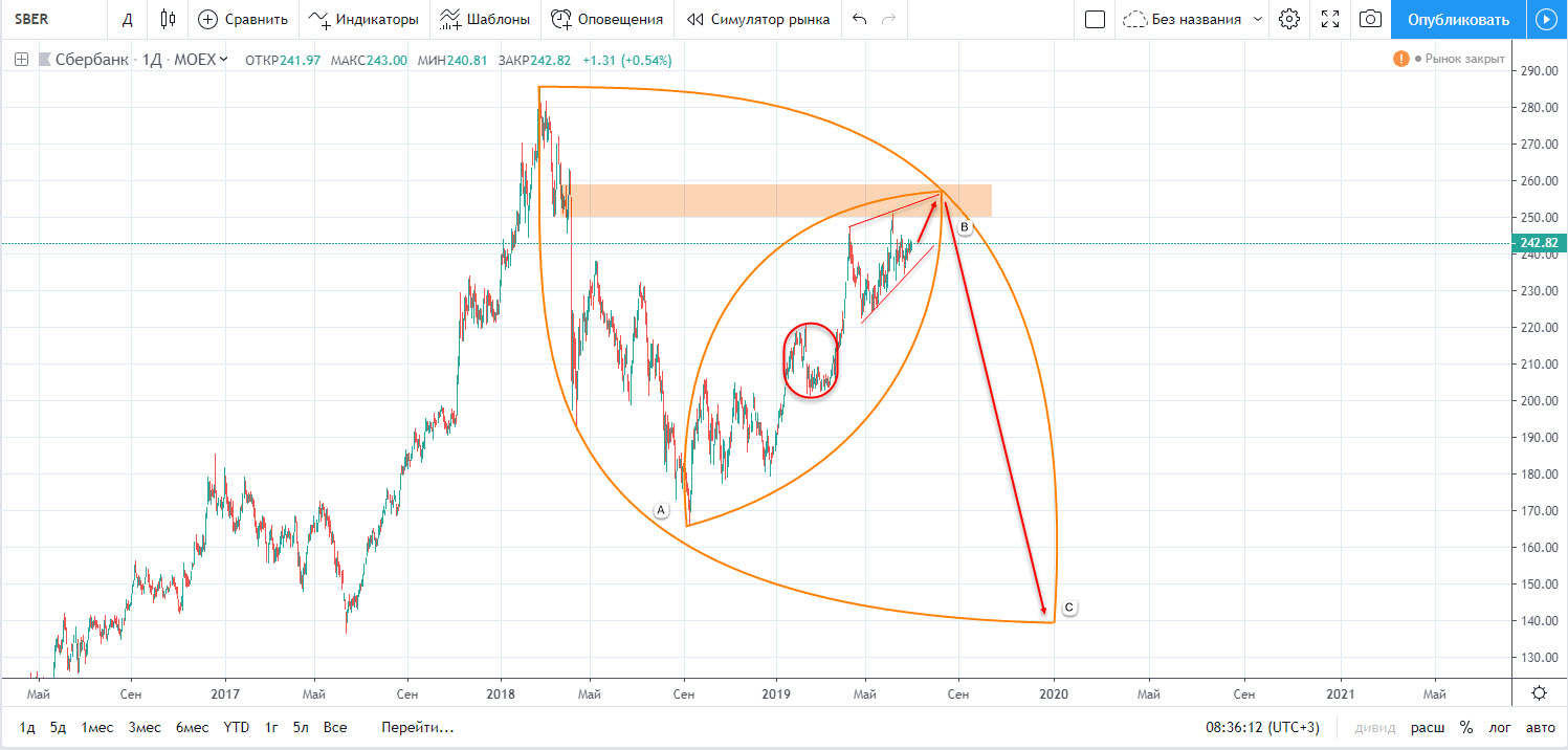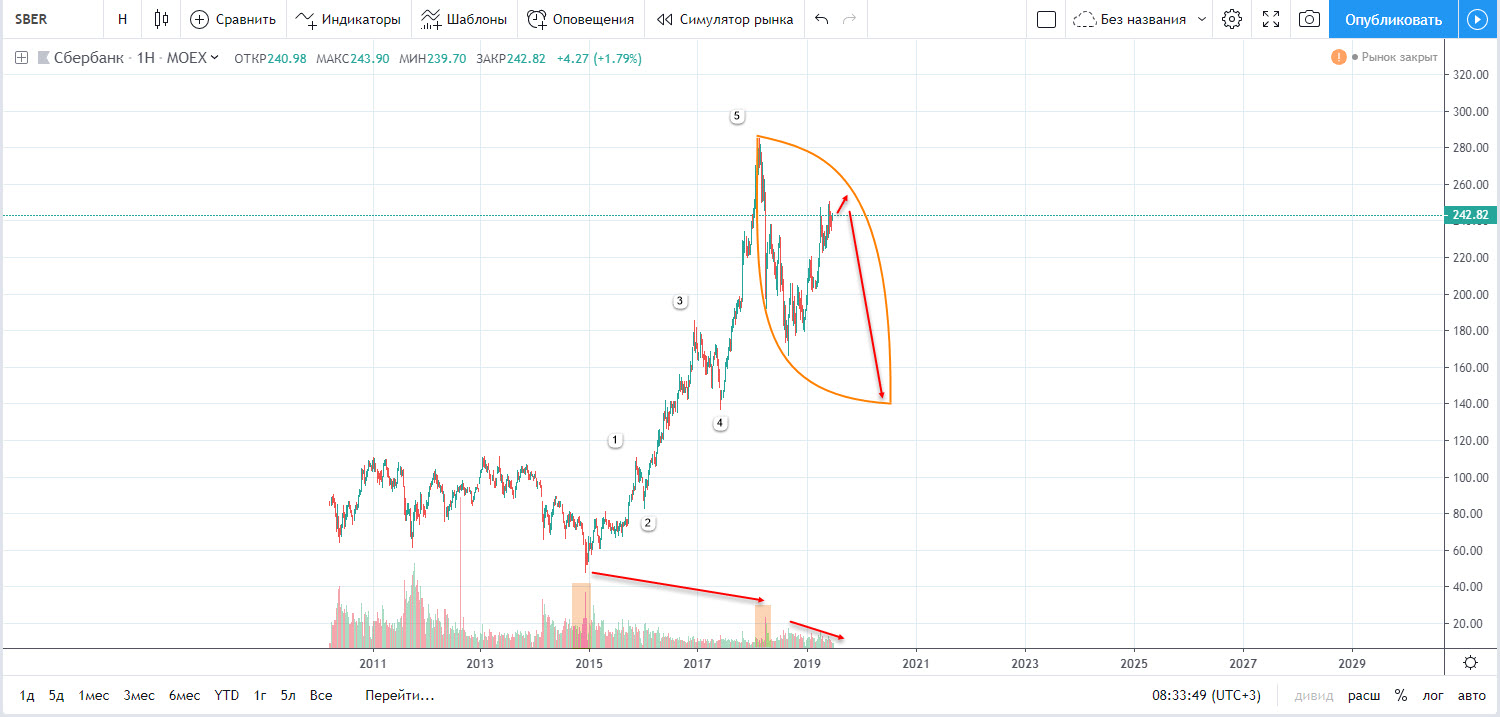 Пассионарий писал(а):Сбербанк, на мой взгляд, завершает формирование бычьей ловушки. Уровень разворота 255-260, цель волны С 150 руб за акцию.