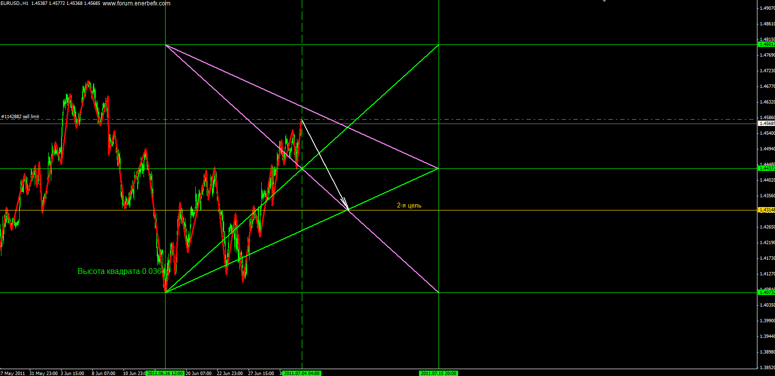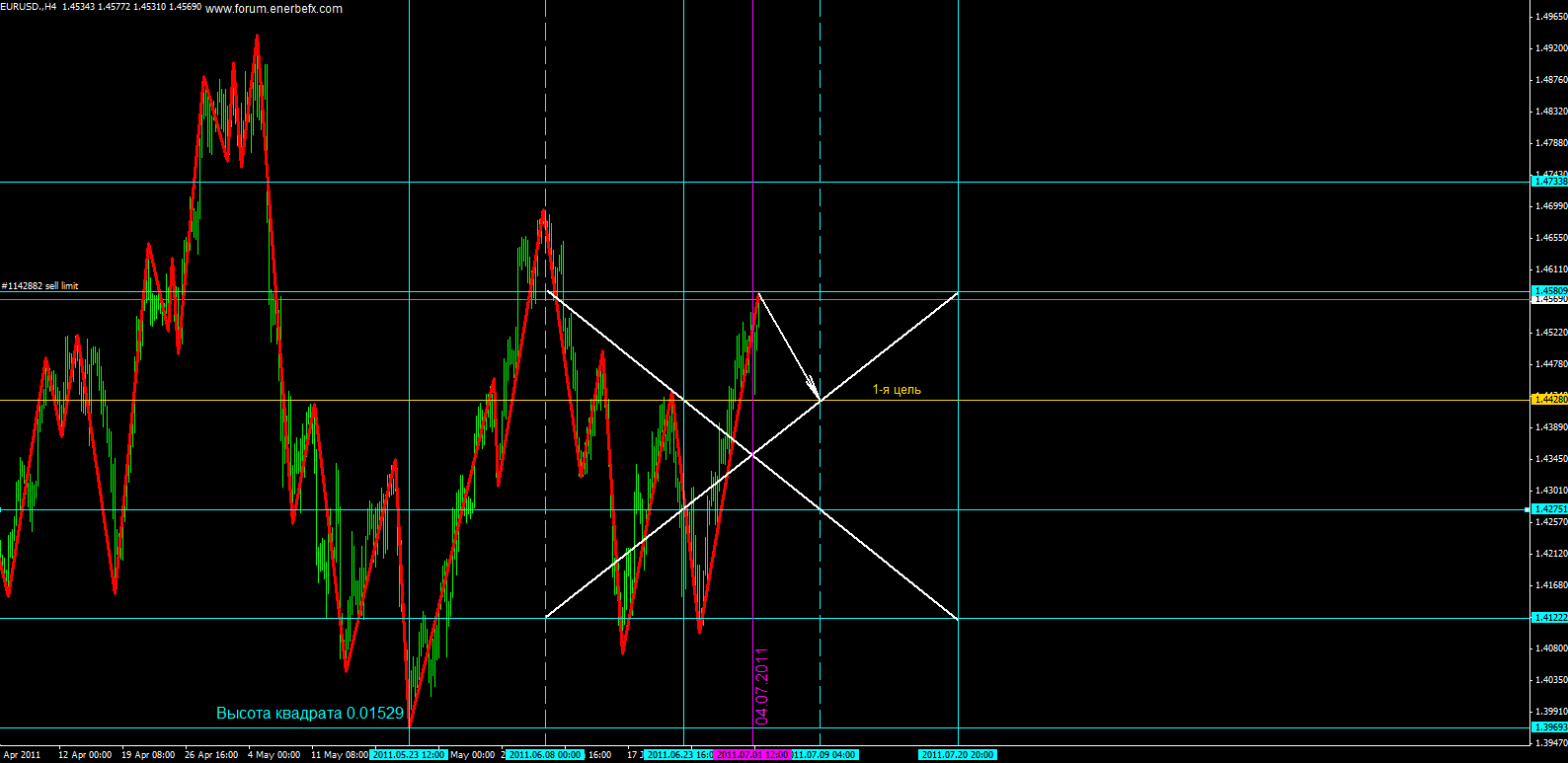 Прогноз евро от 27 до 1 числа... Вход был рассчитан с помощью Квадрата9 с инкрементом 1 календарная неделя. Была использована таблица Excel для построения переменной Таблицы125 и был найден цикл 488, он хорошо показал изменение в прошлом и совпадает с нашим 27.03.2011. Время рассчитывается нечетными числами!! Была найдена переменная 175 единиц,которая указывает на 29 марта,как на дату закрытия первой части открытых позиций.Таблица129 указывает на выход 1.04.2011и закрытие второй части позиций. Сценарий готов!