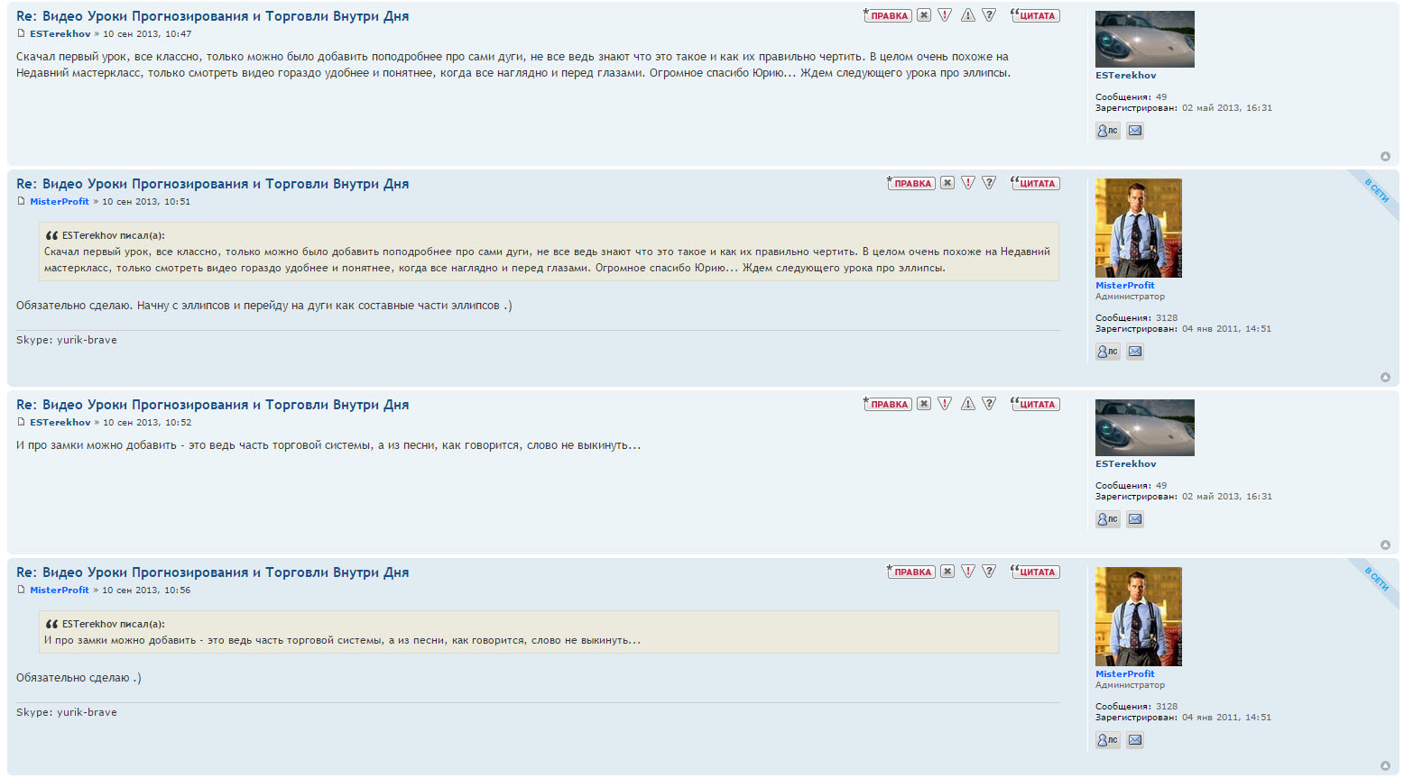 Вчера купил 2 последних видео-урока. Юрий, как всегда, на высоте!!! Множество примеров работы с разными фрактальными моделями и , главное, - понятные и точные входы в рынок с указанием и ,что немало важно, понятным алгоритмом определения целей!!! Прекрасная работа! Мои поздравления! Надеюсь не только мне эти уроки помогут допускать меньше ошибок в торговле, а торговать более успешно и осознанно....и видеть рынок намного яснее и шире.В общем ставлю 5+