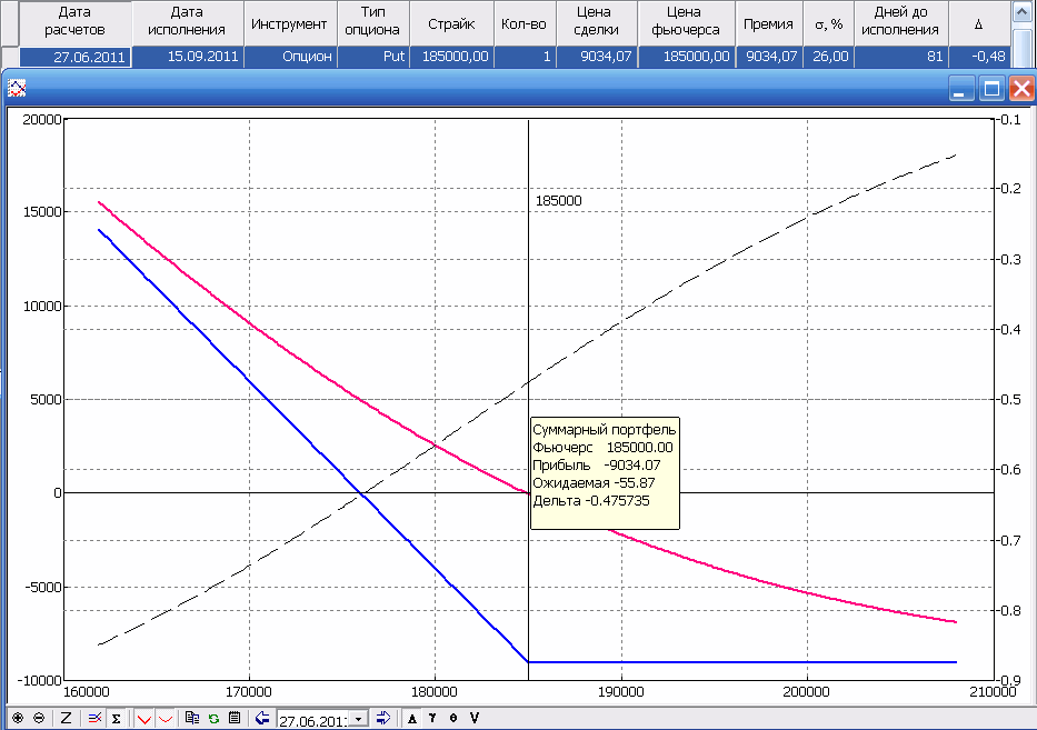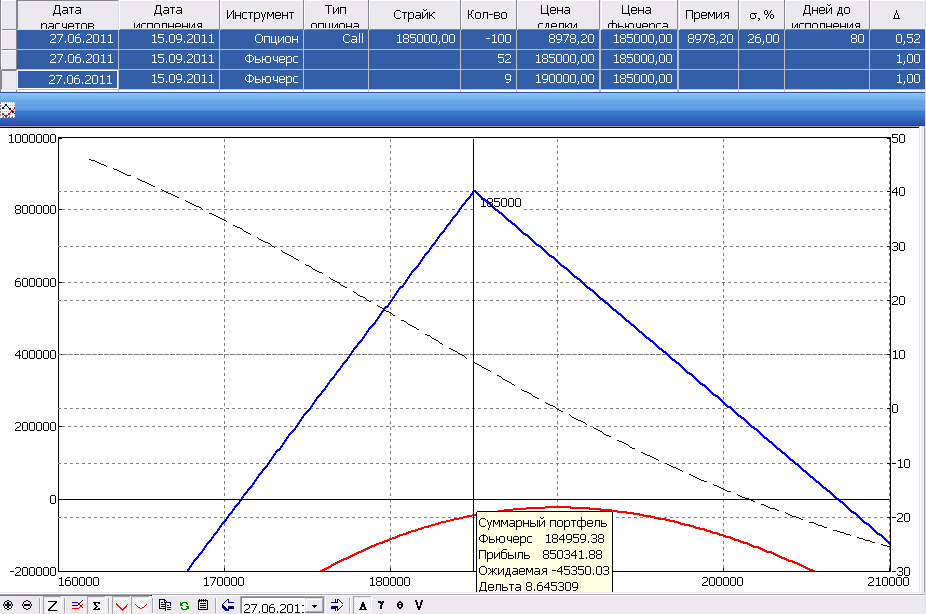 • Если в портфеле имеется 100 проданных опционов Call 185 000 при цене фьючерса 185 000 и IV=26%, то