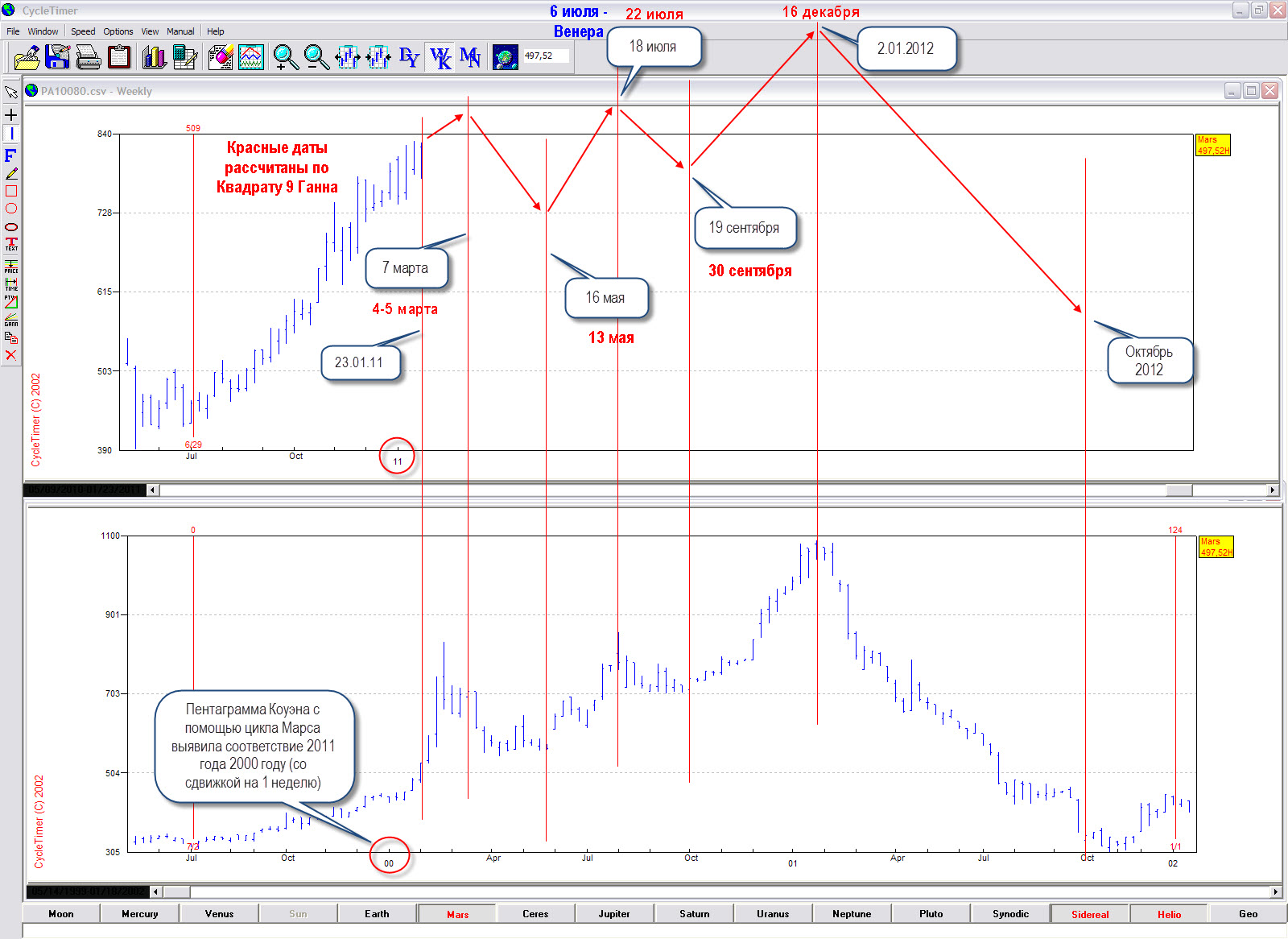 Обратите внимание, даты рассчитанные по разным методам прогнозирования (Пентаграмма Коуэна и Квадрат 9 Ганна) практически (с погрешностью одна неделя) совпадают.