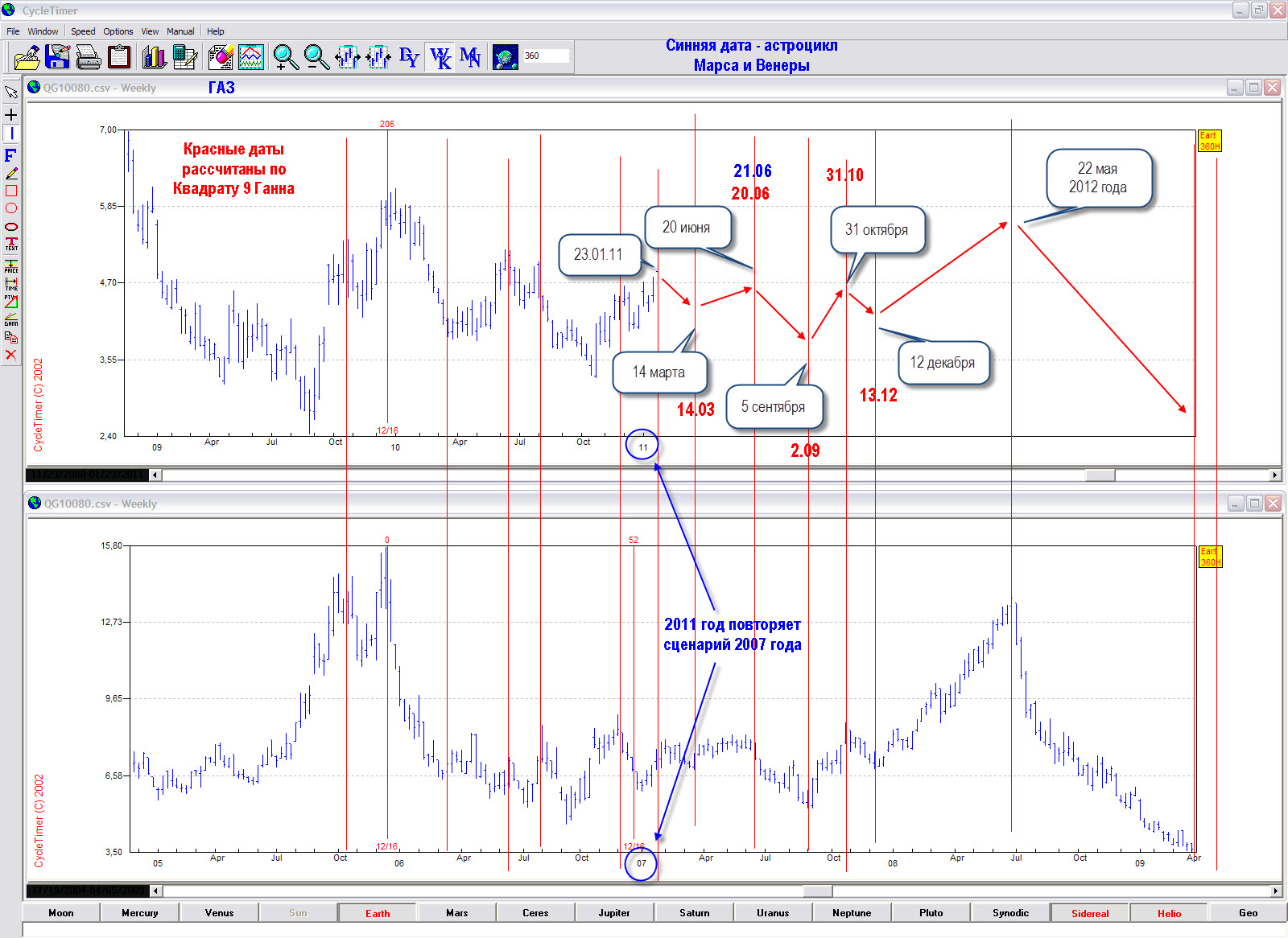 Это говорит и высокой вероятности разворота Газа в эти даты. Ценовые уровни надо определять отдельно с помощью других методов: Волнового анализа, коэффициентов Развития Коуэна, углов Ганна , уровней Мюррея и прочих прогностических инструментов.