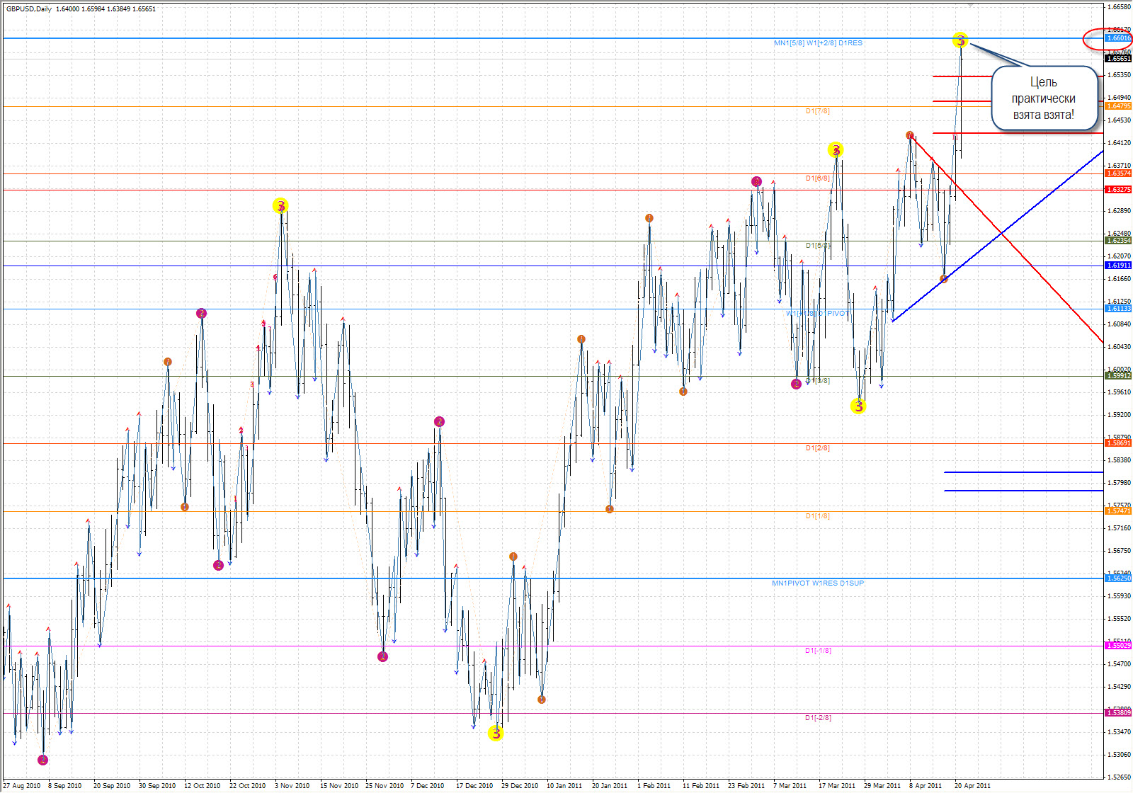 Сегодня 21 апреля цель 1.66 была практически взята (прогноз смотрите постом выше).