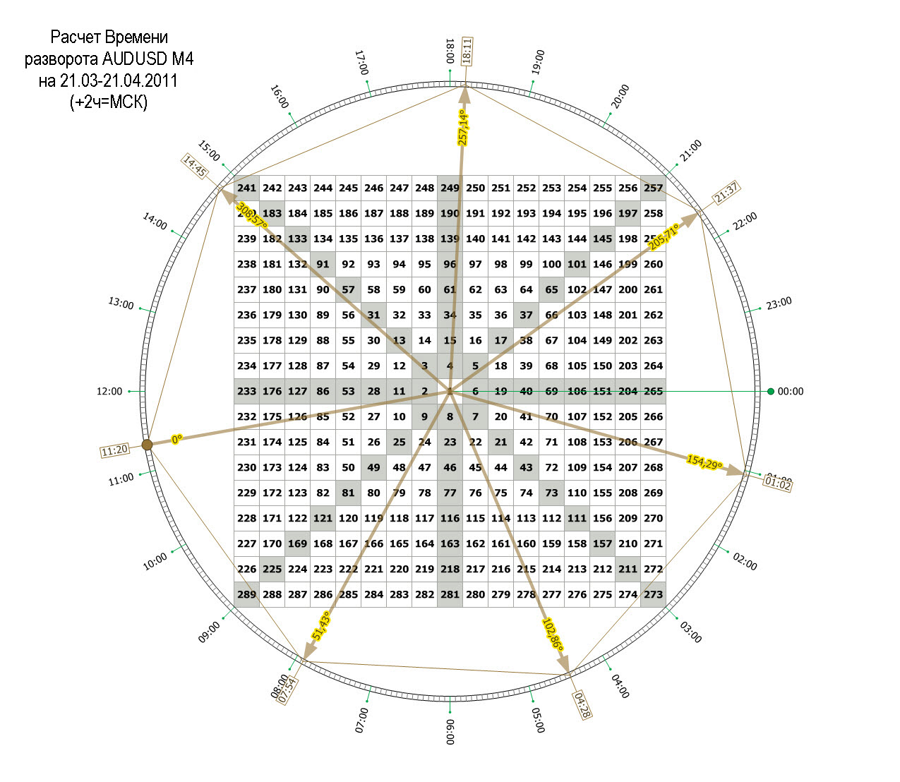 В подписке viewtopic.php?f=4&t=10 в пакете с недельным и дневным прогнозами дается расчет времени разворота для внутри дневной торговли. Ниже отчет по этому прогнозу (пользоваться этим расчетом можно до 20 апреля 2011 года).