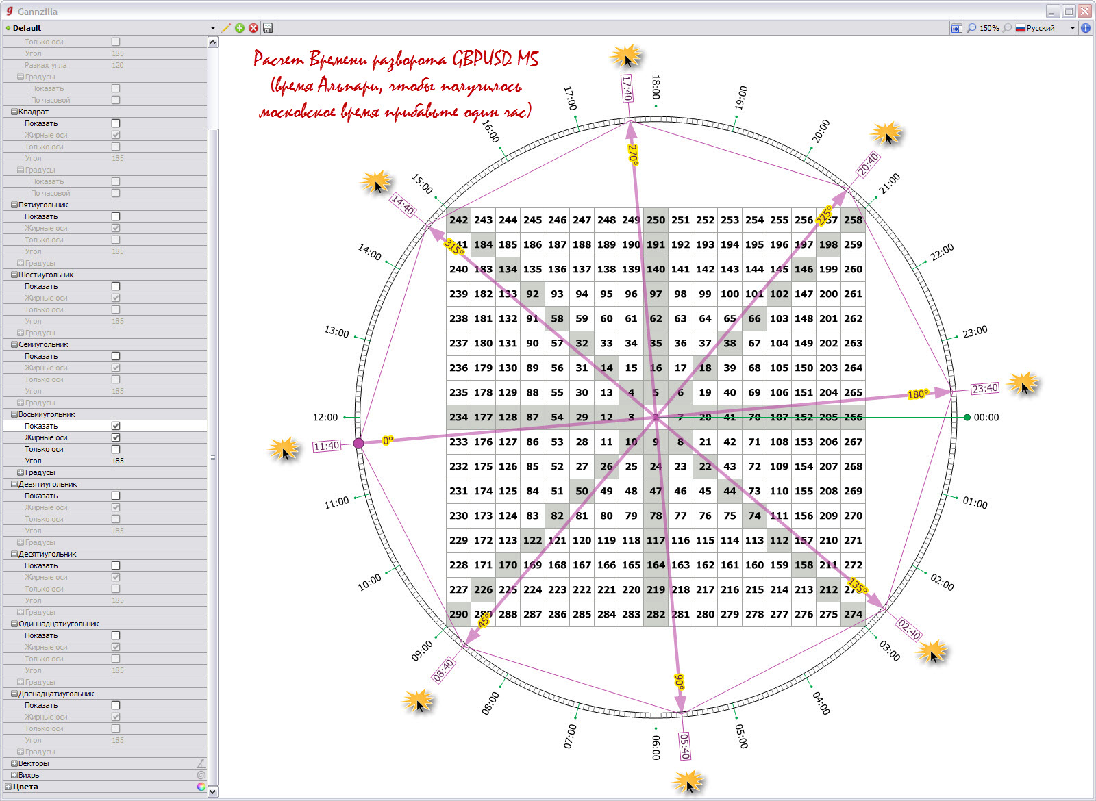 14 мая 2013 года на Сводных Курсах Прогнозирования viewtopic.php?f=4&t=328#p17547 с помощью Квадрата 9 Ганна было рассчитано время разворота GBPUSD для 5-ти минутного графика. В дальнейшем выяснилось что расчет оказался довольно точным (время Альпари). Чтобы получить московское время, прибавьте к нему 1 час.