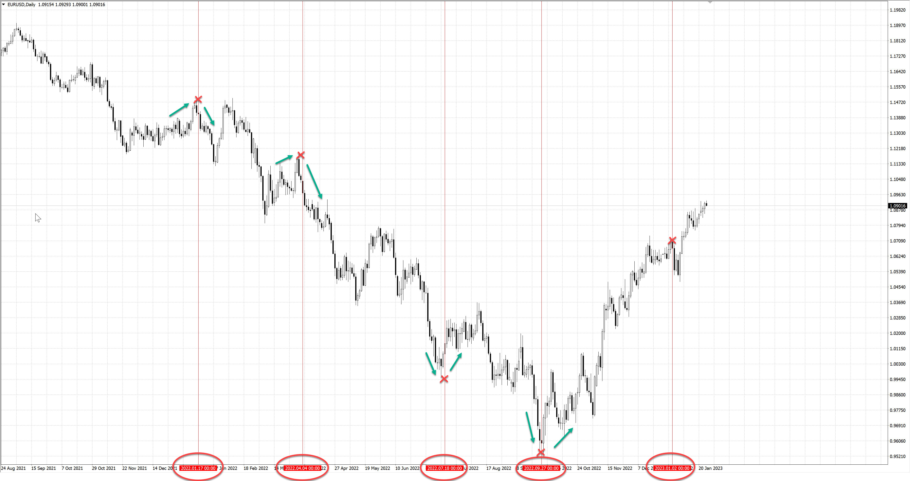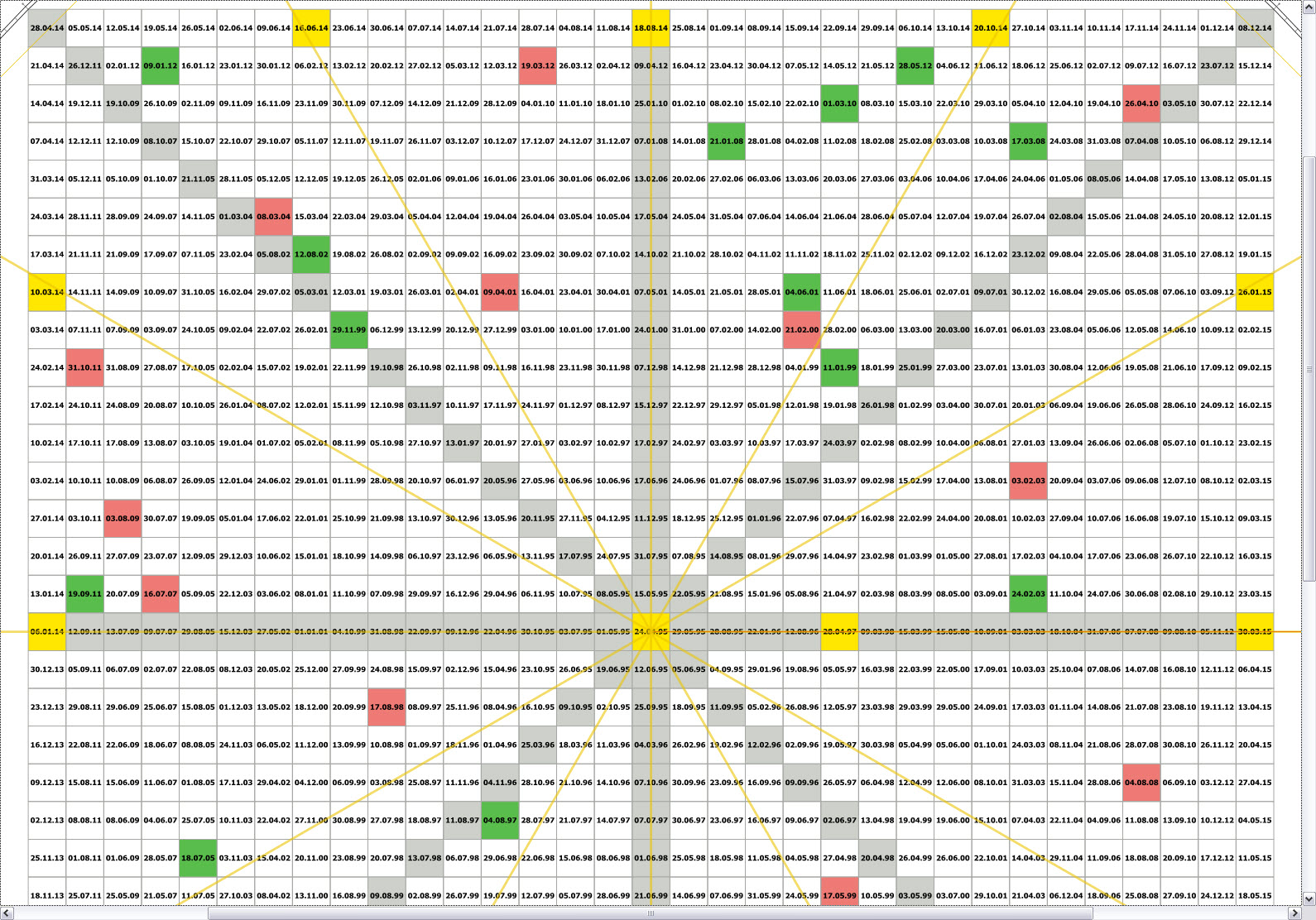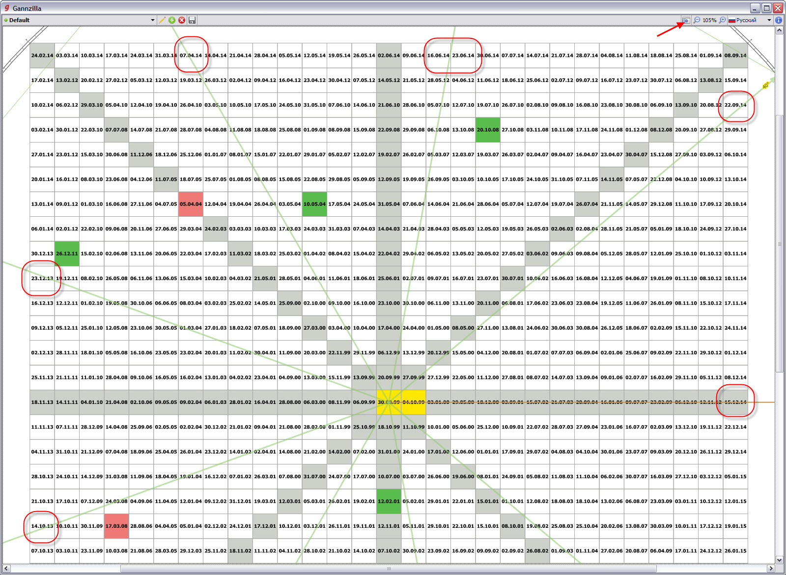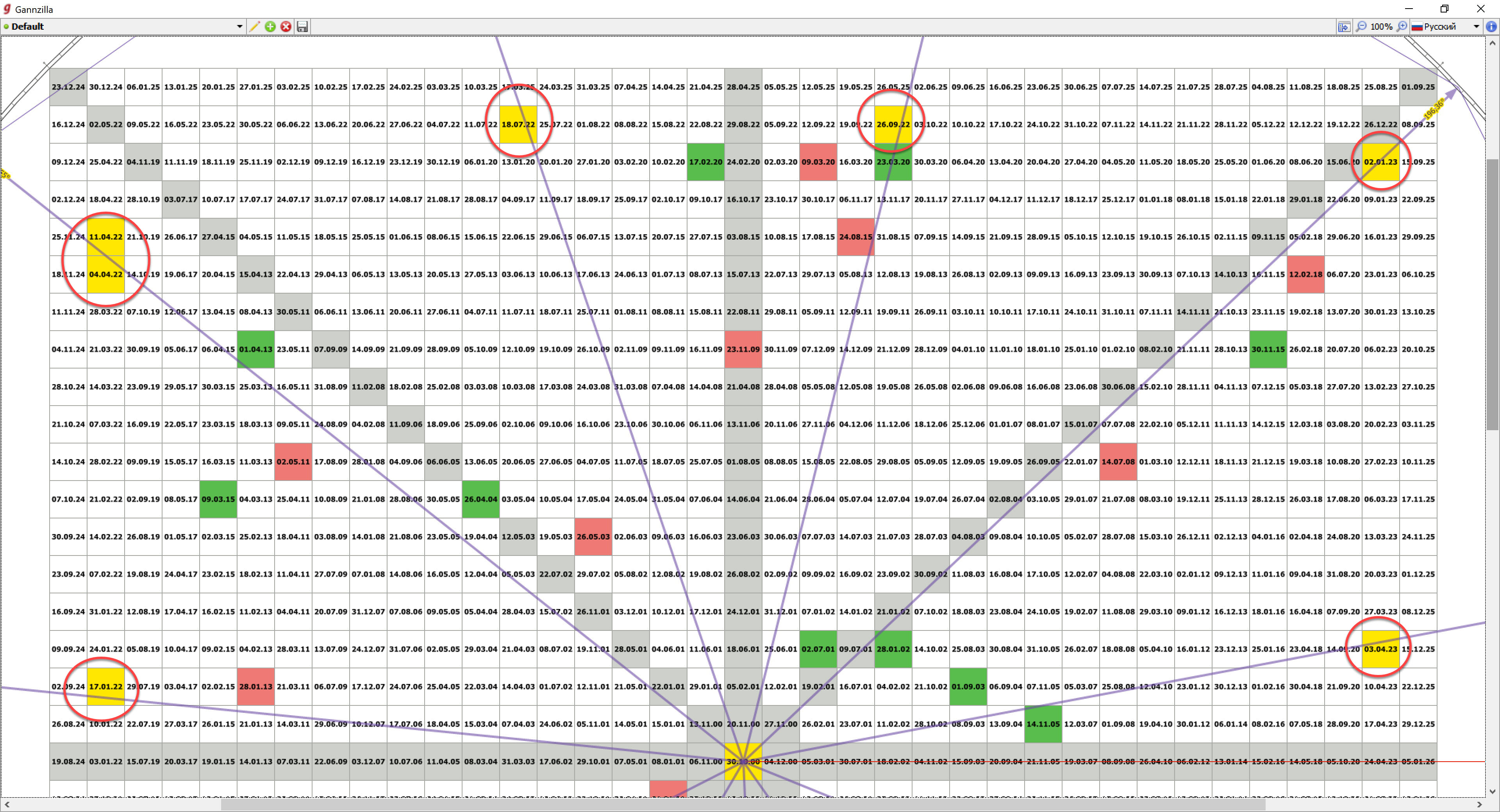 Расчет потенциальных дат разворота производился с помощью Квадрата 9 Ганна в январе 2022 года на 10-ти дневных курсах ФНВА. Ровно через год, в январе 2023 года зафиксировано фактическое выполнение. Обратите внимание, что ВСЕ потенциальные даты на деле оказались ВАЖНЫМИ, так как на них происходили развороты трендов или остановки.