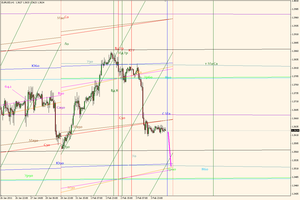 На данный момент сильные линии выделиы жирным цветом. Сверху сопротиления сильнее поддержек снизу. Если ничего не путаю тогда аспект который уже окреп, но не вступил в максимальную силу, действительно на падение, то мы ни при каких обстоятельствах не сможем подняться выше М0 и Са90.