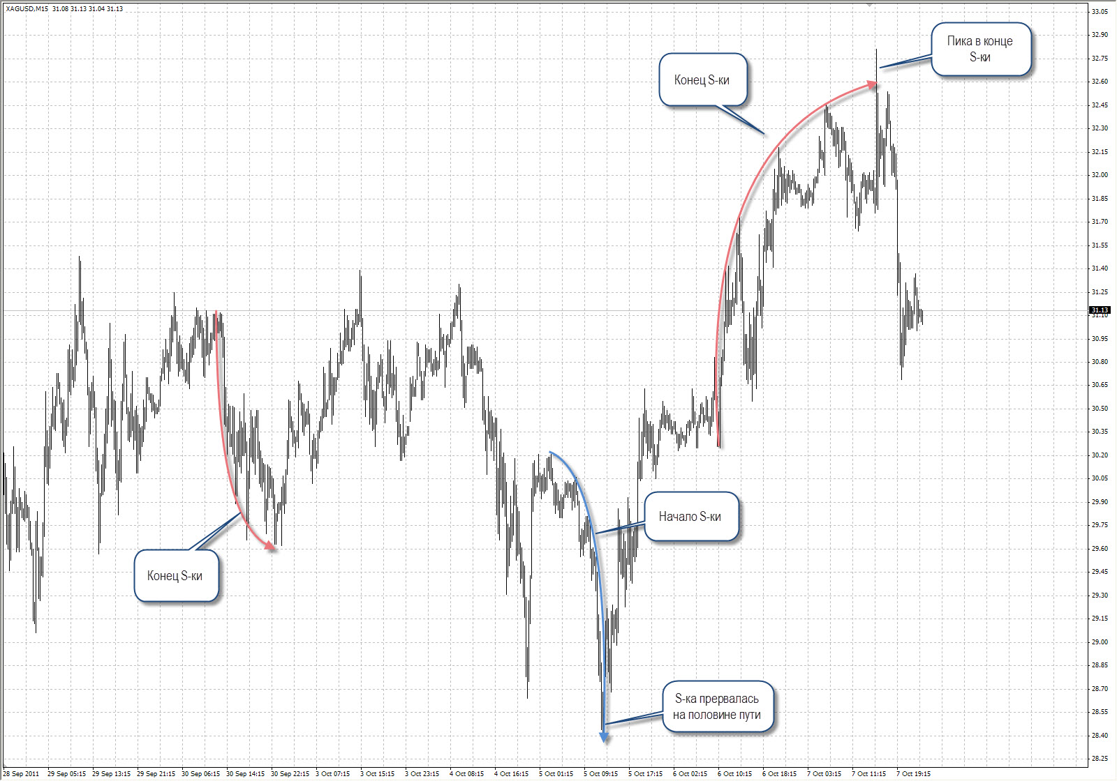 То есть накопление энергии приводит в не к плавному росту, а к скачку. Это хорошо видно, если смотреть на графики сквозь очки "S-ок". Вот смотрите на хорошо читается график Серебра через такие "очки" .))
