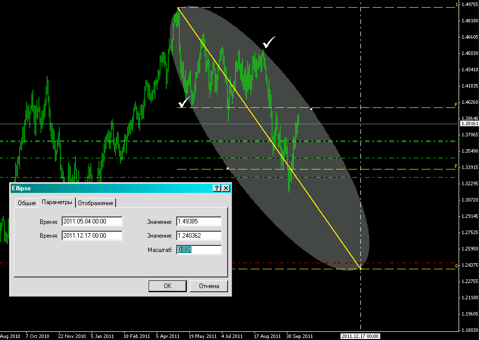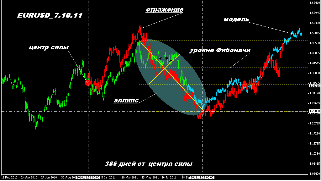 kazachok62 писал(а): По EURUSD модель еще работает. В терминале МТ4 сложно правильно установить масштаб и,соответственно, правильно нанести эллипсы, не зря Ганн учит рисовать свои календарные графики. Поэтому и даты смещаются.