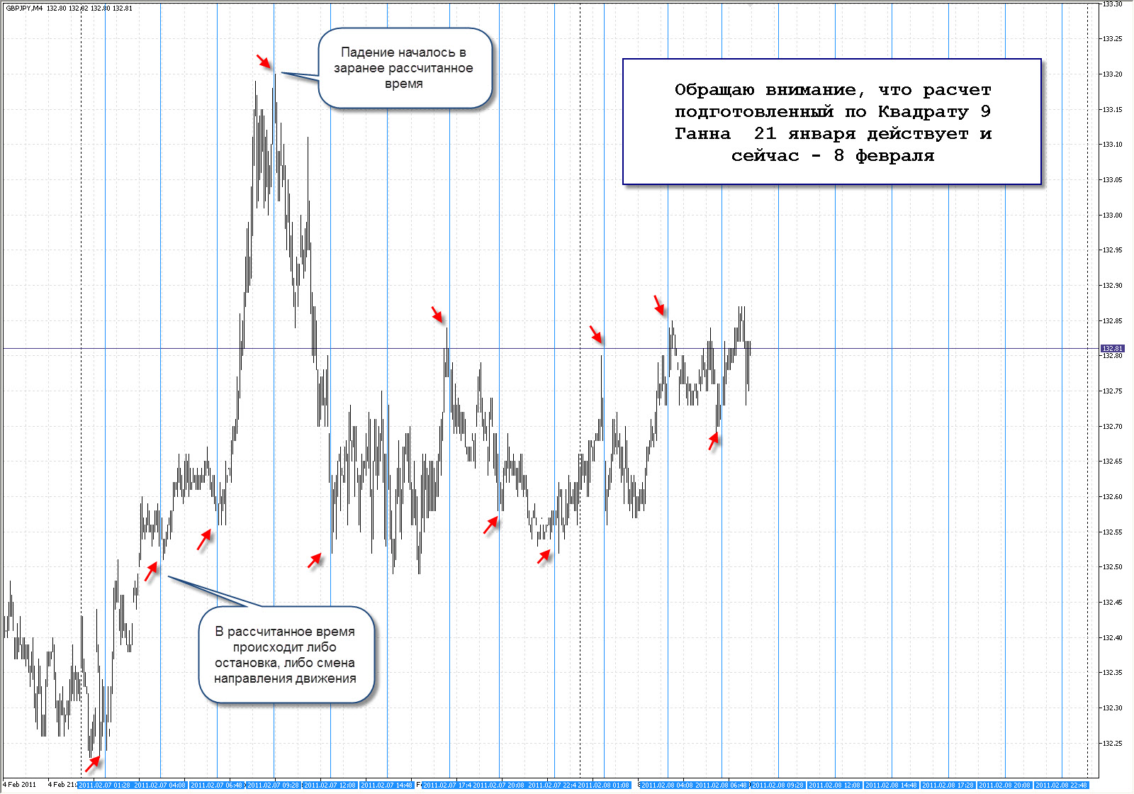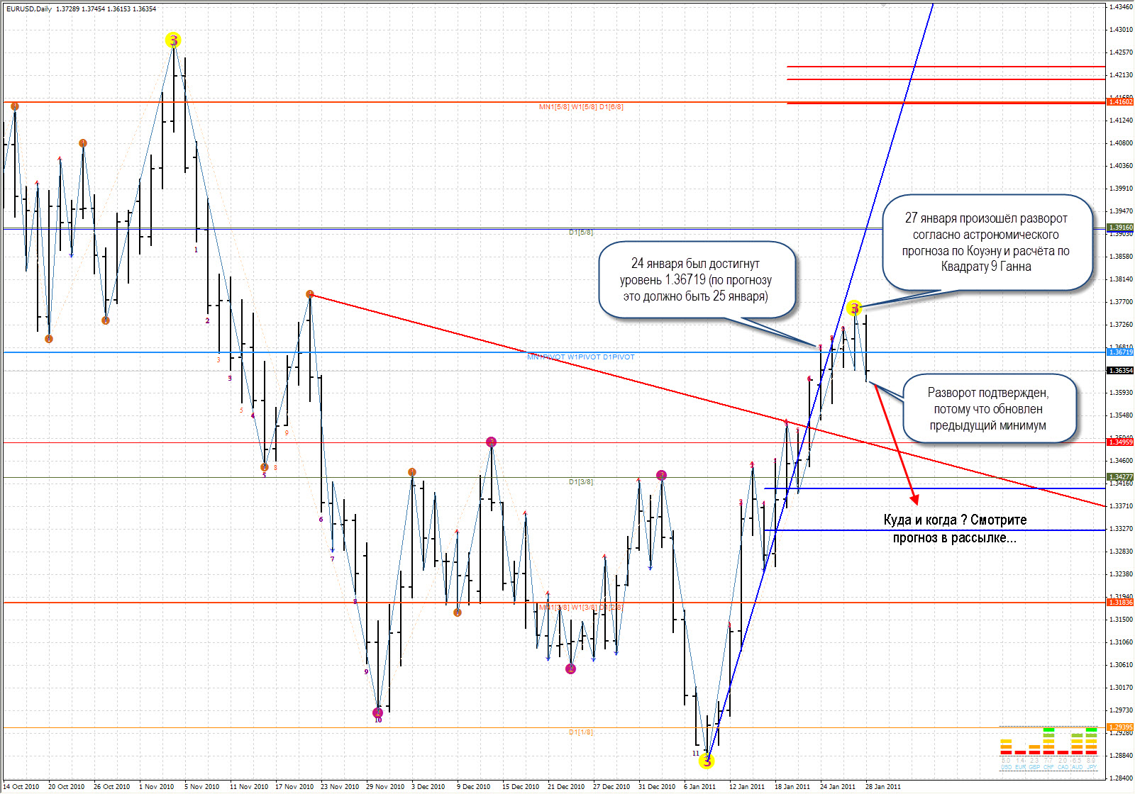28 января 2011 года EURUSD показал жизнеспособность прогнозов разворота по Внутренним Вибрациям актива, выявленных с помощью Квадрата 9 Ганна.