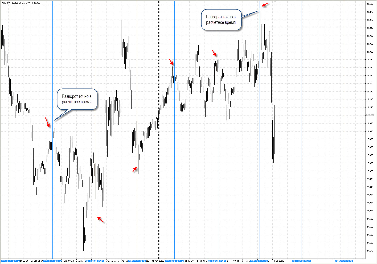 В пакете прогноза viewtopic.php?f=4&t=10 дается расчет ВРЕМЕНИ разворота для 4 (5) минутного графика. Посмотрите на примере Серебра, как четко вчера и сегодня реагировало Серебро в рассчитанное заранее время.