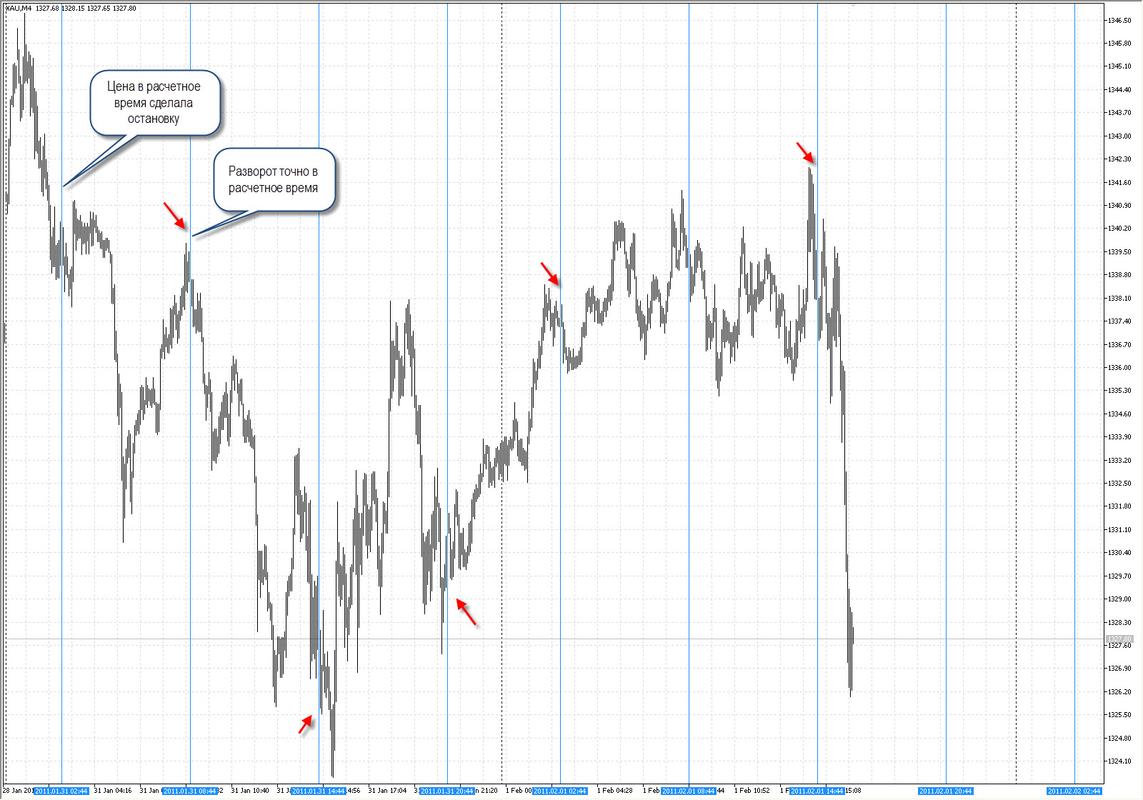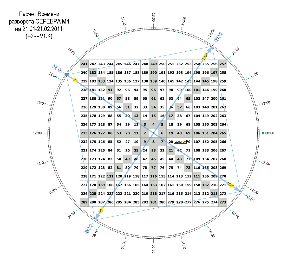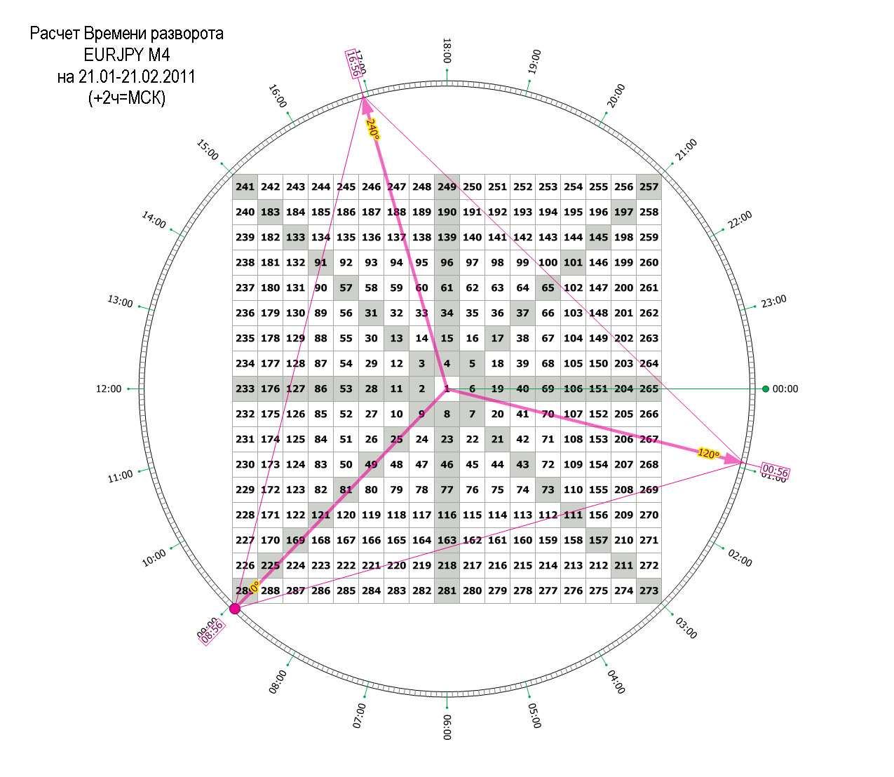 Расчет сделан 21 января 2011 года и действителен до 21 февраля 2011 года. Обратите внимание, как четко на этой неделе цена срабатывала на Сетке Времени (значит и дальше также цена будет вести себя; если применять ВА в этой ситуации, то можно точно открывать сделки).